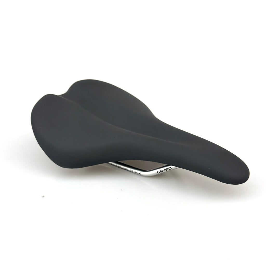 This saddle is slightly wider and shorter than a traditional racing saddle, featuring added padding and a pressure relief channel, while maintaining a minimal weight increase. It comes in black or brown soft synthetic leather with silver chromoly rails.