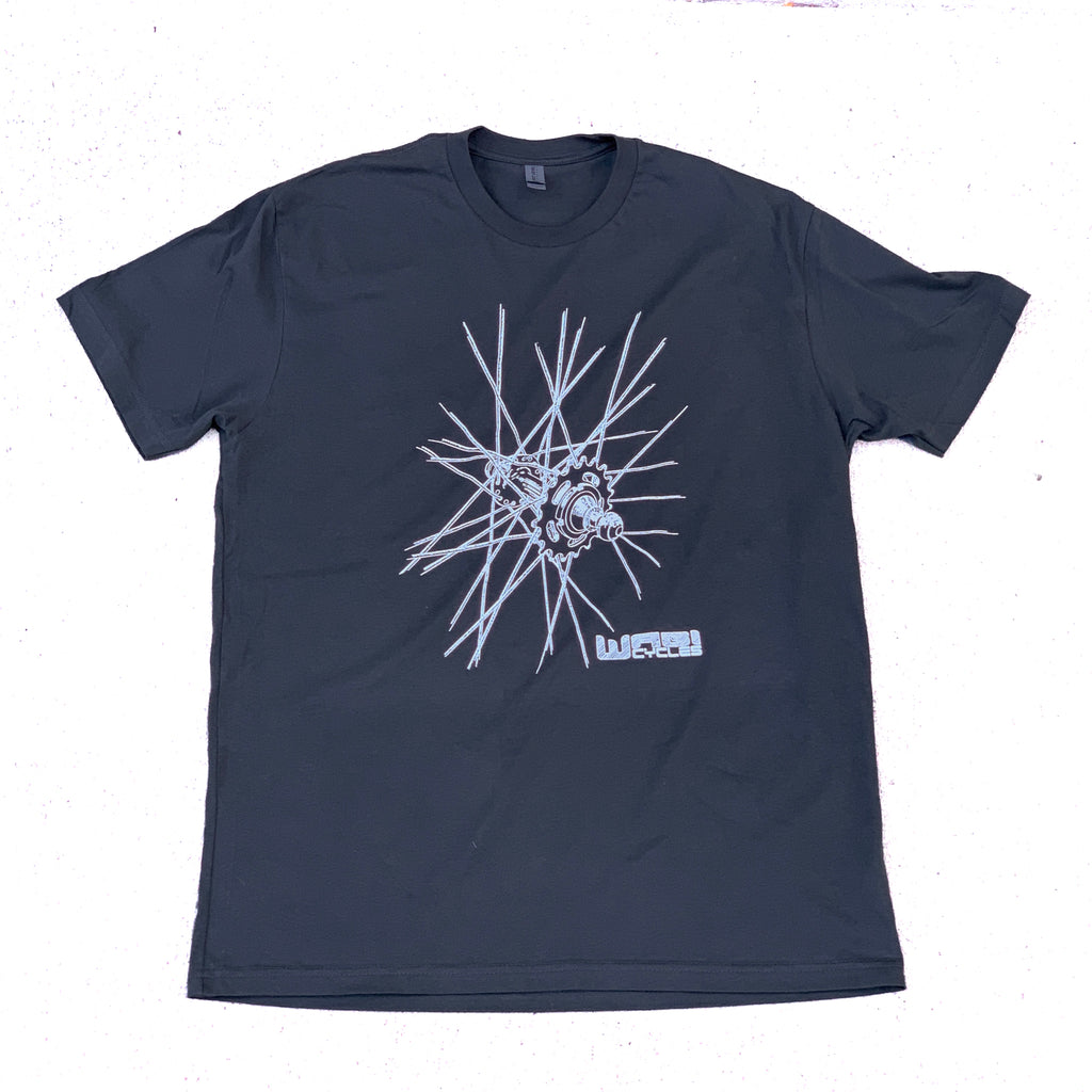 Wabi hub with fixed cog graphic on a grey cotton t-shirt.